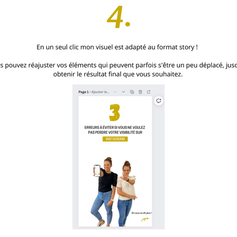 Pas de panique avec cette fonctionnalité Canva, vous allez pouvoir changer le format de votre visuel en un clic et sans perdre le contenu et la mise en page que vous avez réalisé.